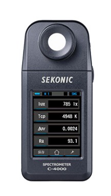 スペクトロメーターC-4000はコンパクトサイズの分光色彩照度計です。基本機能に特化した測定画面で照度、色温度、⊿uv、演色評価指数(CRI、TM-30)、xy色度座標など光測定に不可欠な数値を見やすく表示し、現場での速やかな数値確認が行えます。また専用アプリケーション「SEKONIC LD」とBluetooth接続することで、本体のメモリー測定や、本体メモリーデータ取込、グラフ表示が可能となります。