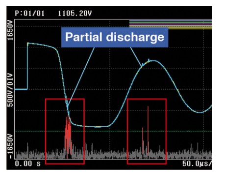 ●ノイズに埋もれた「微弱な部分放電」を検出することで、モーター巻線間の絶縁不良(疑似ショート)がわかる ●HIOKIオリジナルフィルター搭載 (*1) *1:応答波形に現れる高周波成分のうち、波形全体に現れるノイズ成分を除去し、部分放電成分だけを抽出して判定。アイシン・エィ・ダブリュ株式会社様と共同開発