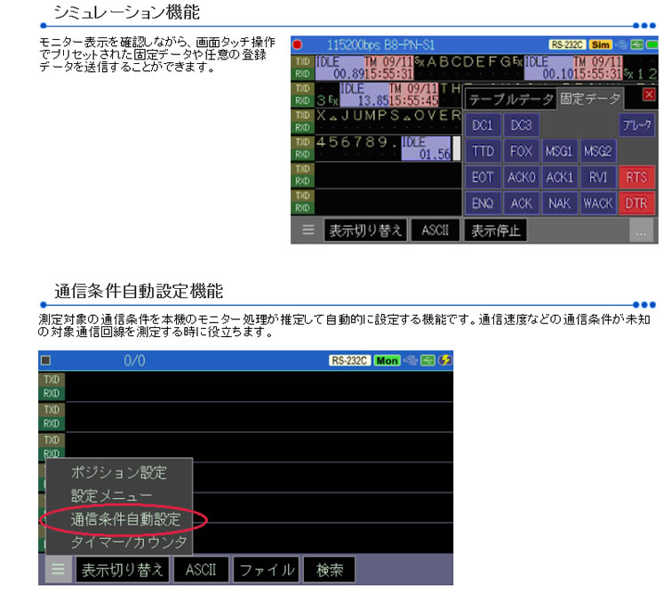 LE-120SAは、利用頻度の高い調歩同期通信に特化した手のひらサイズのラインモニターです。指先による軽い画面タッチやスワイプによるスマホのような操作が可能です。電池込みで300gと軽量なため、出張テストでも手軽に持ち運びができ、通信システムの開発時だけでなく、メンテナンスにも最適な製品です。