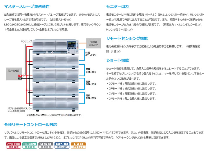 負荷容量が175W、350W、1050Wと2100Wブースターの4機種を150Vシリーズ、800Vシリーズの2系統ラインナップしました。1050W機種をマスター機として、2100Wブースターを最大4台まで増設、合計9.45kWまでの対応が可能です。CC、CV、CR、CPをベースにCC+CV、CR+CV、CP+CVの7モードに対応します。外部からの制御用に、外部アナログコントロール、USB、RS-232Cを標準装備。GP-IBは、別売オプションとなります。