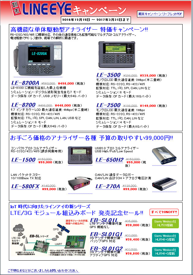 株式会社ラインアイでは、2016年12月15日~2017年3月末日まで、『2016年度期末キャンペーン』を実施いたします。高機能な単体駆動型アナライザーからお手頃価格のアナライザまで特別価格でご提供致します。ぜひこの機会にご検討くださいますよう、よろしくお願いいたします。